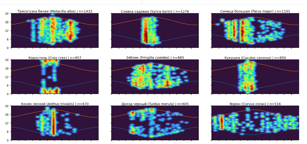 - Сезонная и суточная активность. Можно фиксировать начало сезона размножения (по первым песням), суточные паттерны пения и сроки миграции (появление/исчезновение голосов).