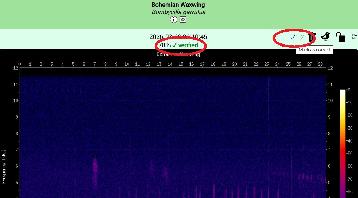 - Для BirdNET-Pi подготовлены доработки интерфейса, которые позволяют при прослушивании записей отмечать как true positive, так и false positive. Это удобно для накопления проверенной базы и последующей оценки качества распознавания. Данные таких проверок можно использовать для расчёта precision: Precision and recall — Wikipedia. Архив с доработками доступен по ссылке verified_update.zip. Файл play.php в каталоге scripts нужно заменить. Скрипт setup_review_db.sh изменяет структуру базы данных birds.db для хранения результатов проверки. Скрипт export_birddb_verified.py формирует файл BirdDB_verified.txt для загрузки в RU-BIRDS.